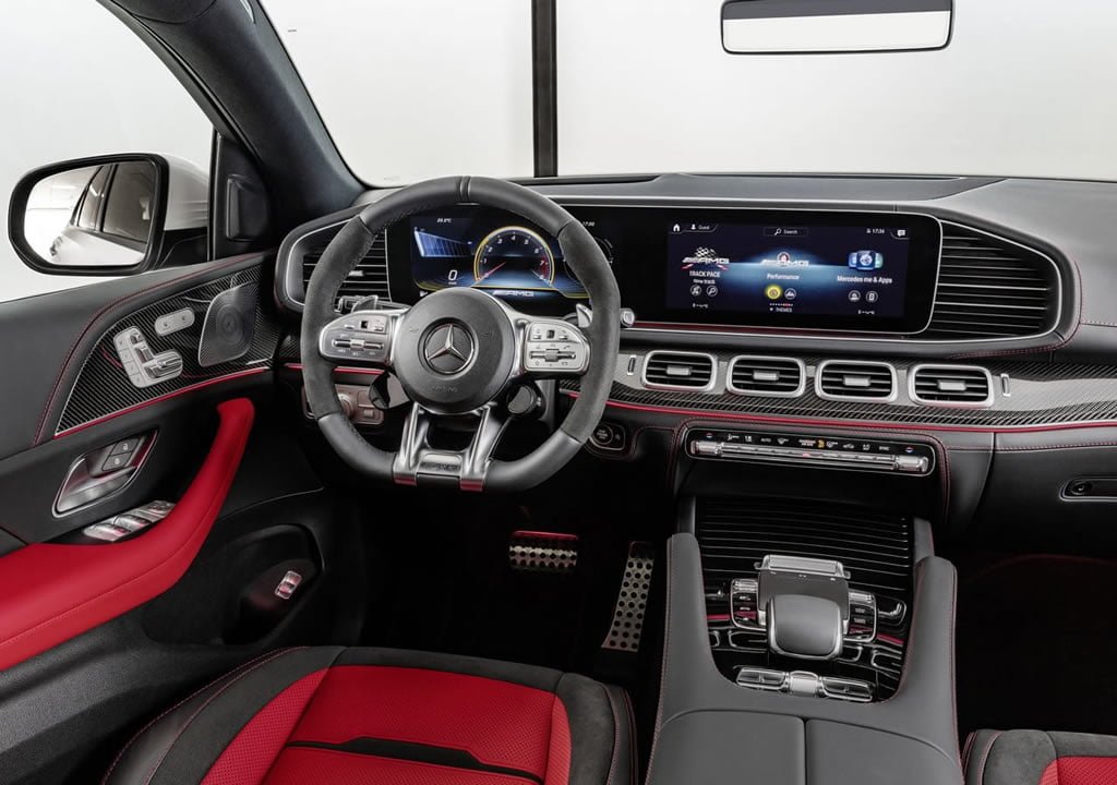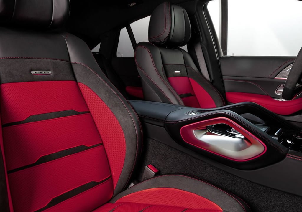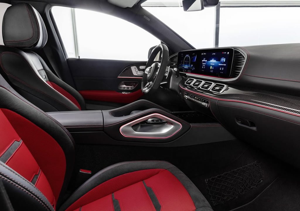 Donanım kısmına geçtiğimizde standart GLE Coupe’den farklı olarak komple AMG body kiti ilk bakışta bizleri karşılıyor. 20 ila 22 inç arası jant seçenekleri, kırmızı fren kaliperleri de cabası. Yaşam alanında ise alcantara ve deri kumaşla kaplı direksiyon simidi, yine aynı malzeme ile bezenmiş spor koltuklar, kapı iç kaplamaları ve diğer alanlar yer alıyor. Öte yandan karbon fiber trimler, kırmızı dikişli ve deri kaplı kokpit, kırmızı iç ambiyans aydınlatması da sunuluyor. Bunların yanı sıra yeni GLE Coupe’de yer alan bütün özellikler eksiksiz olarak bulunuyor.