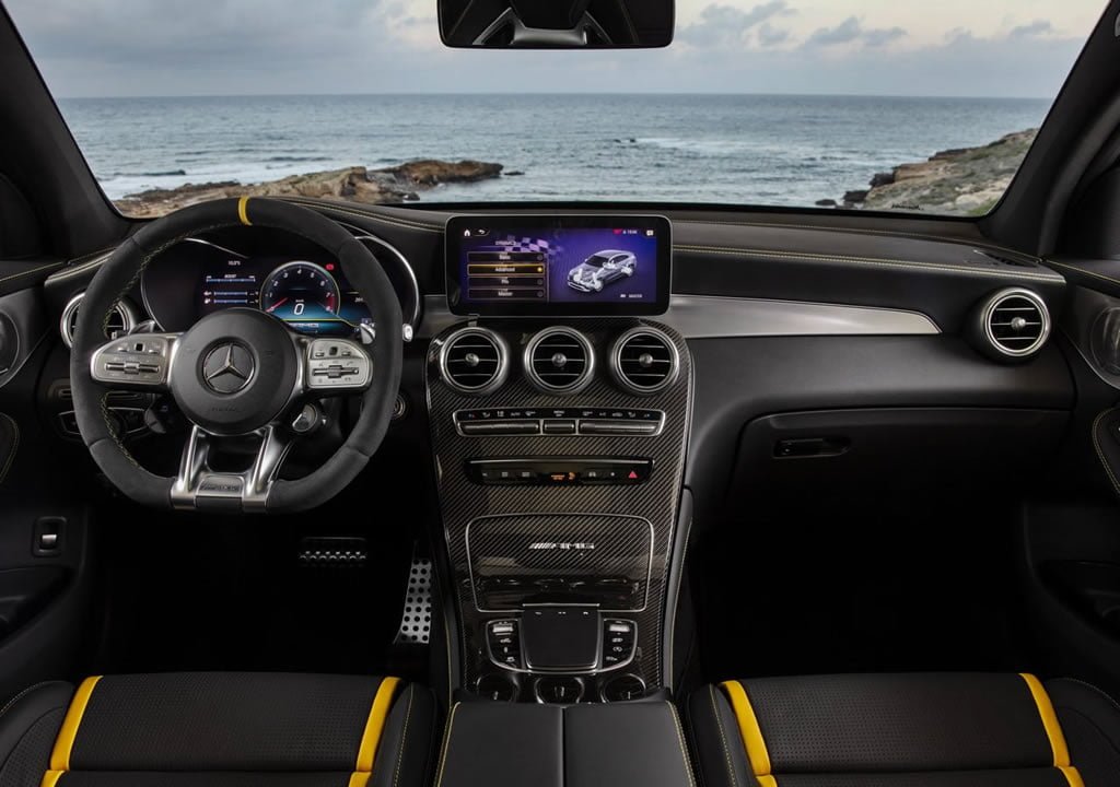 Yaşam alanına geçtiğimizde ise Artico AMG spor deri koltuklar, alcantara kaplı direksiyon simidi, karbon fiber iç trimler öne çıkıyor. Yapay zeka özellikli MBUX alt yapısına sahip multimedya sistemine sahip olan 2020 Mercedes-AMG GLC 63 S Coupe modelinde 12.3 inçlik dijital gösterge paneli ve 10.25 inçlik dokunmatik multimedya ekranı bulunuyor. Ayrıca dijital gösterge ekranında Classic, Sport ve “Supersport adlı üç farklı tema seçeneği sunuluyor.