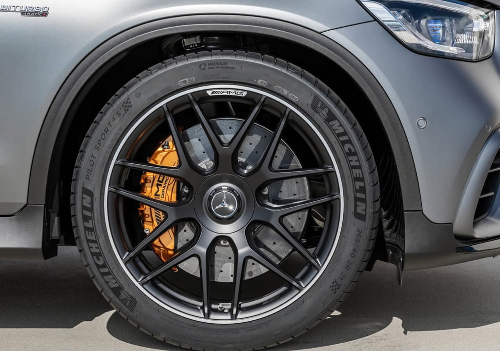 2020 Mercedes-AMG GLC 63 Coupe standart 19 inç jantlarla geliyor ve bu jantlara önde 235-55, arkada 255-50 ebatlı lastikler eşlik ediyor. S versiyonu ise 20 inç jantlara sahip olup önde 265-40, arkada ise 295-40 ebatlı lastiklerle sunuluyor. Opsiyon olarak 21 inçlik jantlar var ve bu jantlara ise önde 265-40, arkada 295-35 lastikler eşlik ediyor.