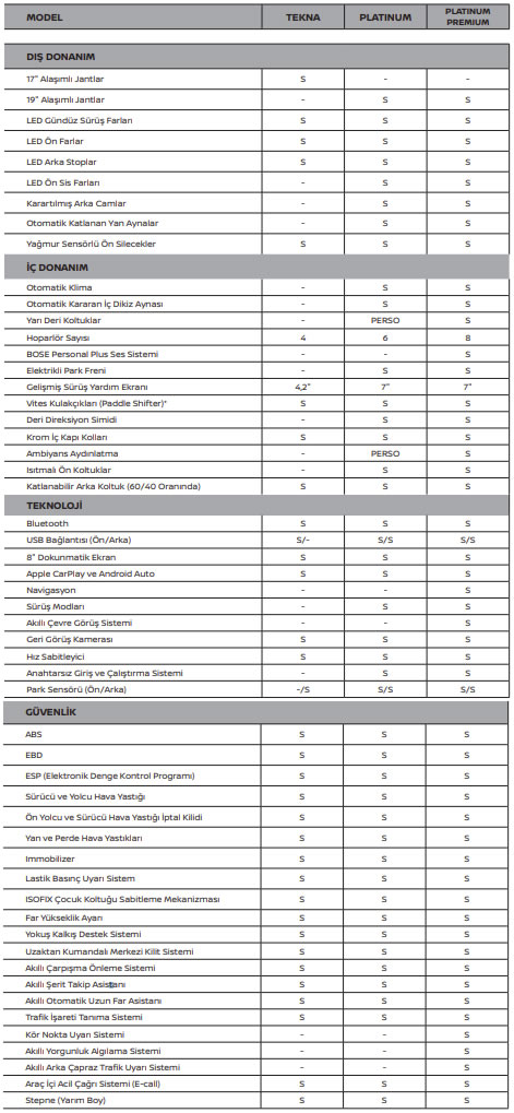 Üç farklı donanım seçeneğiyle Türkiye kullanıcısına sunulan yeni Juke’ta 11 farklı dış renk seçeneği, 17 ve 19 inçlik jant seçeneği, çift renkli kumaş ve siyah renkte deri-alcantara kombinli koltuk seçenekleri bulunuyor. Detaylı donanım listesine de bakalım.