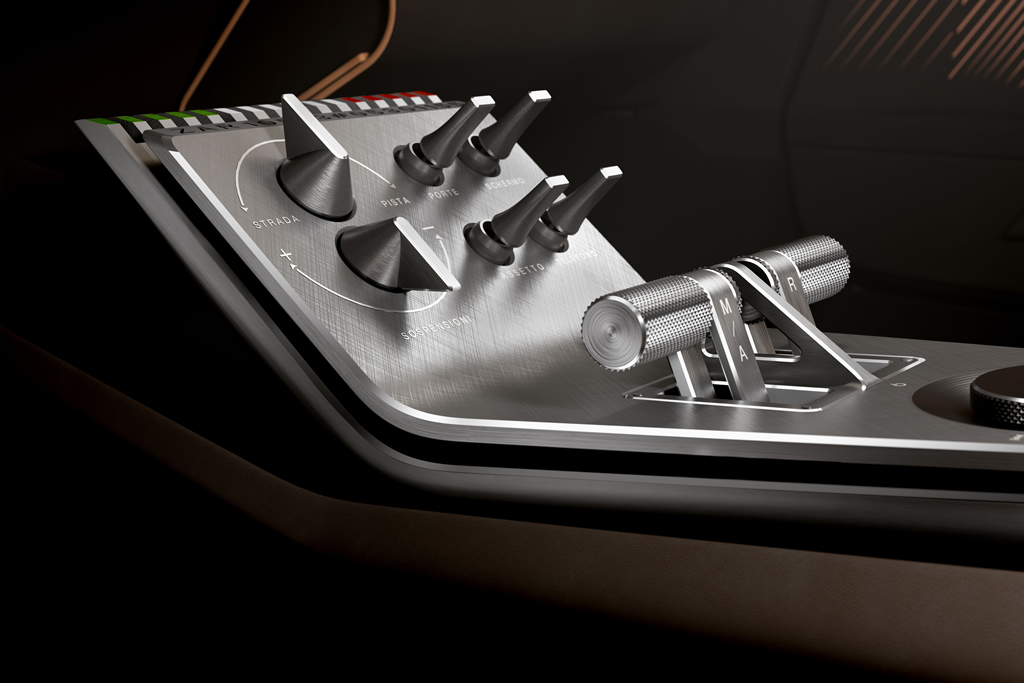 İtalya bayrak renklerinin inceden işlendiği metal levhaya yeniden gelelim. Aracın sürüş modları ve vites kontrol tuşları bu alana yerleştirilmiş. Hemen üstünde ise geri çekilebilen dijital kontrol paneli bulunuyor. Dört yapraklı yonca ise vitesin olduğu levhanın en uç kısmına işlenmiş. Yine ortalanacak şekilde tavan kısmına da farklı kontrol elemanları yerleştirilmiş.