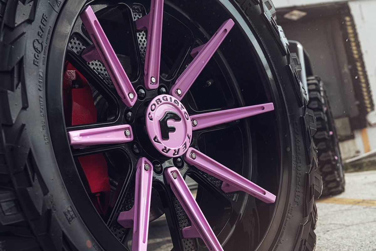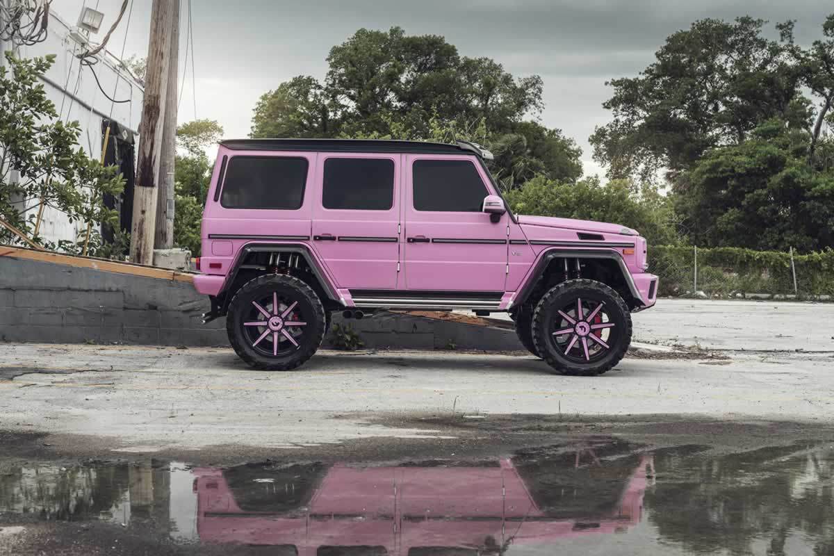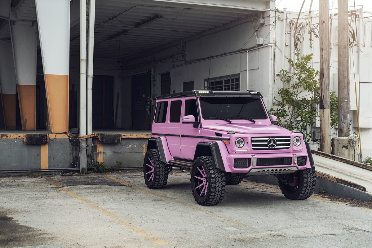 Amerika’da, Güney Florida’da Chloe adlı saç stilisti bayan, Mercedes G550 4×4² aracını pembe rengi temel alarak tepeden tırnağa modifiye ettirmiş. Kaportadaki renk değişimine ek olarak 24 inçlik Forgiato adlı jantların Terra serisi Gambe-1 adlı modelini 37 inçlik devasa off-road jantları ile kullanmış. Bu arada jantlarda kendisine özel olarak hazırlanmış. Sonuç olarak ortaya fazlasıyla ilgi çekici, tatlı mı tatlı Pembe SUV çıkmış. Hadi fotoğraflarına bakarak daha yakından inceleyelim.